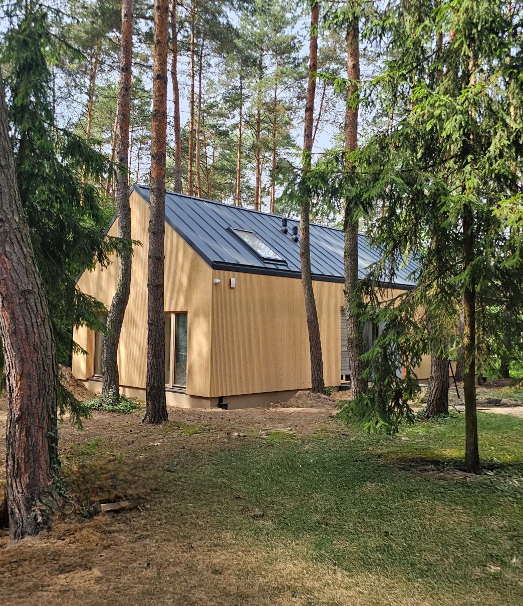 Designed by a visionary Polish architect, the house is carefully positioned to frame sweeping views of the surrounding woodland. Expanses of floor-to-ceiling glass invite the forest into every room, creating a quiet dialogue between interior and landscape. The palette of multi-colored wood species used throughout the structure mirrors the richness of the natural surroundings, allowing the home to blend organically into its setting.