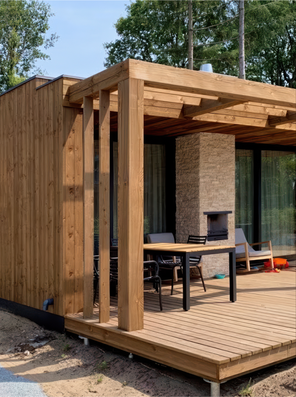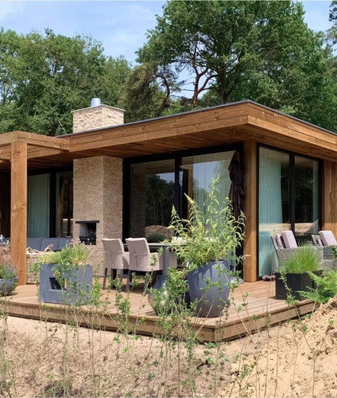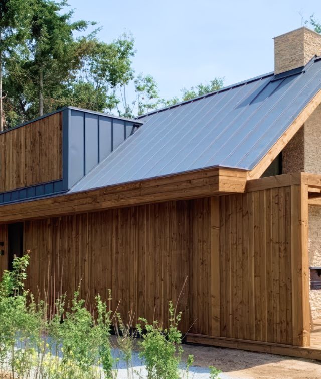 The client selected a combination of charred Scandinavian spruce in a hazelnut tone and black Douglas fir, bringing a striking contrast of colour and texture to the modern pool house. The pairing adds both depth and warmth, perfectly complementing the peaceful, natural setting.